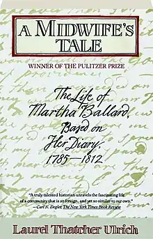 A Midwife's Tale examines the life of Northern New England midwife Martha Ballard, and provides a vivid examination of ordinary life in the early American republic, including the role of women in the household and local market economy, the nature of marriage and sexual relations, aspects of medical practice, and the prevalence of violence and crime. In this book, Ulrich effectively and simultaneously builds historical knowledge of the colonial world and Martha Ballard's biography.[15]