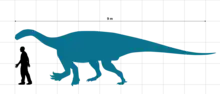 At its time in the Early Jurassic epoch, Ledumahadi is thought to have been the largest land animal that had ever lived.[1] At the age of 14 years, L. mafube is estimated to have reached a maximum size of around 12 tonnes (13 short tons) in body mass, significantly larger than its relatives. L. mafube was more comparable to the later sauropod Diplodocus in body mass.[1][3] An ichnotaxon named Tetrasauropus belongs to a sauropodomorph that is estimated to have a hip height of 2 m (6.6 ft), meaning that it likely belongs to Ledumahadi.[4]