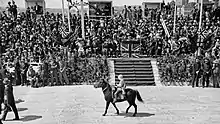 As he arrived in Martin Place, accompanied by 25 police, Gwyther was met by 10,000 cheering citizens.[12][9] The Secretary of the Royal Agricultural Society, Colonel Somerville, also greeted him.[12] He was wearing "khaki breeches, boots, and leggings, and a thick coat, and [was] carrying a cloth sun hat in his hand."
