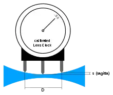 A lens clock is a mechanical dial indicator that is used to measure the dioptric power of a lens. It is a specialized version of a spherometer. A lens clock measures the curvature of a surface, but gives the result as an optical power in diopters, assuming the lens is made of a material with a particular refractive index.