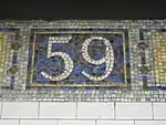 The station used to have all green tile which has been covered up except for one "59th Street" sign near the south end of the northbound platform. There are whimsical stylized mosaics of coffee cups and slippers in varied colors at random spacing near the stairways to the Broadway and IRT local trains.[117]