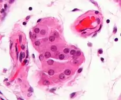 ![]() Micrograph showing a cluster of Leydig cells (center of image). H&E stain. | |