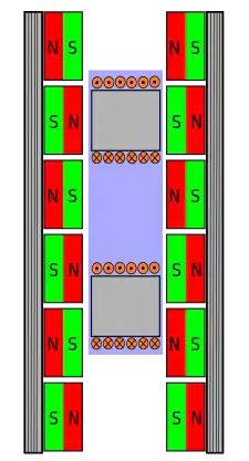 Free-body diagram of a U-channel synchronous linear motor. The view is perpendicular to the channel axis. The two coils at centre are mechanically connected, and are energized in "quadrature" (meaning a phase difference of 90° (π/2 radians) between the flux of the magnets and the flux of the coils). The bottom and upper coils in this particular case have a phase difference of 90°, making this a two phase motor (not to scale).