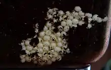 The snails are oviparous and lay shelled eggs.[26] The number of eggs per clutch and clutches per year varies by environment and age of the parent, but averages around 200 eggs per clutch and 5-6 clutches per year. The eggs hatch after 8-21 days and the snails emerge as juveniles. They reach adult size in about six months, after which growth slows, but does not cease until death. Life expectancy is 3–5 years in the wild and 5–6 years in captivity, but the snails can live for up to 10 years.[25]
