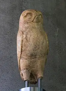 Owls have often been depicted from the Upper Palaeolithic onwards, in forms from statuettes and drawings to pottery and wooden posts, but in the main they are generic rather than identifiable to species. The little owl is, however, closely associated with the Greek goddess Athena and the Roman goddess Minerva, and hence represents wisdom and knowledge. A little owl with an olive branch appears on a Greek tetradrachm coin from 500 BC (a copy of which appears on the modern Greek one-euro coin) and in a 5th-century B.C. bronze statue of Athena holding the bird in her hand. The call of a little owl was thought to have heralded the murder of Julius Caesar.[19][20]