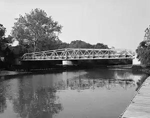 The swing bridge on Locke Avenue over the Raccoon Creek was 154 feet 6 inches (47.09 m) long. It was a single-lane, center pivot swing bridge that carried vehicular traffic over Raccoon Creek. The swing span was designed to manually rotate at its center pivot pier, which allowed marine traffic to pass underneath. It was constructed in 1911.[1] The swing span had been locked in the closed position since 1971. The main channel of the Raccoon Creek was under the northern span of the bridge and has not been dredged since April 1965.