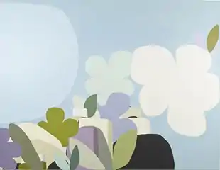 The "Mound" paintings,[45] begun in 2011, offer compositions that are less dense and feature sculptural shapes resembling buildings, appliances, boxes, or mountains.[3][46][14][26] Amanda Church describes them as "mini-worlds open to myriad interpretations."[3][26][25] In her "Cliff Flower" and "Lamb's Ears" works (2015–7)[47] Belcourt incorporates a more varied palette—including black and greyed color shades—as well as curved, plant- and blimp-like forms that break up the space and are influenced (in shape and color) by her interest in gardening.[44][27][25] Critics suggest these more organic and anthropomorphic forms (reflected in titles connoting both plant and animal life) convey a paradoxical sense of being both rooted in the world and imbued "with a distinct sense of self-reliance."[44][25] In her 2020 show at Locks Gallery, Belcourt departed from her characteristic oil works, presenting collages made of painted and cut gouache shapes, which nod to the energetic simplicity of Matisse's cutouts from the late 1940s.[48]