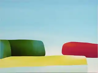 In the early 2000s, Belcourt began to make more concrete references to landscapes inspired by stark Canadian coastal vistas and wilderness; these references result in a representational/abstract ambiguity enabling the juxtaposition of more concepts (e.g., painterliness and Pop artificiality) and feelings (humor, surreality, erotic anxiety) in her paintings.[34][13][5][35] Works such as Sky Painting (2000) feature subtly modulated, horizontal bands suggesting stretches of land, sky and sea, their spacious calm disrupted with the intrusion of incongruous red tongue- or finger-like shapes.[36][37][13][34] In Island (2000) and Woo (2001), small tufts of grass transform abstract color-field paintings into seascapes—in these cases unsettled by what The New Yorker describes as "a Gustonish serpent slithering into Eden" in the former, and a red eel- or finger-like shape popping through the surface in the latter.[37]