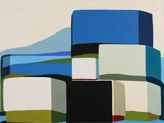In the "HedgeLand Paintings" (2009–10),[43] Belcourt shifts in a geometric direction, replacing formerly sweeping vistas with dense, fractured configurations of stacked brick- or box-like, modular forms that press against the picture plane and defy spatial logic.[6][2][31] The imagery of these paintings ranges from clearly referenced landforms—sometimes wrapped around architectonic, gate-like shapes or monoliths—to almost purely abstract, fluid configurations of soft-edged, rectangular shapes that resemble the compressed stacking of form in a cityscape.[6][3][14] Belcourt's portrayal of light through the interplay of lighter façades and shadowed edges is a key component of her later work, creating a convincing sense of three-dimensionality and space beyond the canvas in essentially flat, two-dimensional paintings.[44]