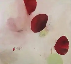 Belcourt's early painting has been characterized as abstract and intensely physical, with a combination of sensuality, aggression and rough, raw feeling that ran counter to the cool, conceptual art dominant in the 1990s.[17][29][32][16] Critics compare the work's dense surfaces to those of Elizabeth Murray and its gestural violence to the paintings of Joan Mitchell and Cy Twombly.[17][33][16] Characteristic works by Belcourt in this period feature elemental, mysterious dark- or blood-red biomorphic blobs, which hover on layered, creamy surfaces suggesting flesh or earth that she distressed with scuffs, scars, punctures and stains.[17][19][33][26] In her review of Belcourt's first solo show, New York Times critic Roberta Smith notes subtle indications of an interest in the body and landscape, pronouncing the effect of works such as My Beautiful Family (1995) as "peculiarly vulnerable" like "a painting with scraped knees."[17]