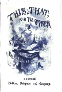 At the age of 15, Moulton began to publish the work which she had written for the past eight years. It would be difficult to say what it was that inclined her to a literary life as she had no literary friends. She felt her movements had to be secret as if she were committing a crime when she sent off her first verses to a daily paper published in Norwich, Connecticut. It was on her way from school one day that she happened to take the paper from the office; and, when she opened it, there were the lines she had written. Three years later, Messrs. Phillips, Sampson and Company, of Boston, published for her "This, That, and the Other," a collection of stories and poems which had appeared in various magazines and newspapers.[3]