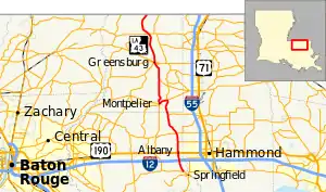 From the south, LA 43 begins at a junction with LA 42 just outside the Livingston Parish town of Springfield. The route heads north through an area known as Hungarian Settlement and passes through an interchange with I-12 at exit 32, connecting with the cities of Hammond and Baton Rouge. Immediately north of I-12 is an intersection with LA 1040 (Old Baton Rouge Highway), an older alignment of US 190. LA 43 enters the village of Albany and becomes known as Montpelier Road. In the center of town, LA 43 intersects US 190 (Florida Boulevard), which serves local traffic along the I-12 corridor. Immediately north of this junction, LA 43 crosses the Canadian National Railway (CN) line at grade.[2][3][4]
