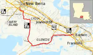 La 83—From a junction with La 14 at or near Curtis through or near Lydia and Weeks Island to a junction with La-US 90 at or near Baldwin.