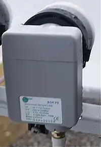 A low-noise block downconverter (LNB) is the receiving device mounted on satellite dishes used for satellite TV reception, which collects the radio waves from the dish and converts them to a signal which is sent through a cable to the receiver inside the building. Also called a low-noise block,[1][2] low-noise converter (LNC), or even low-noise downconverter (LND),[3] the device is sometimes inaccurately called a low-noise amplifier (LNA).[4]