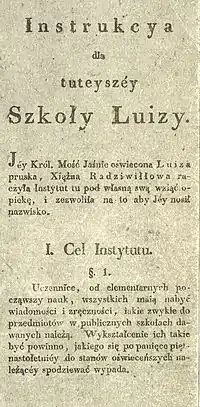 There were a few private schooling establishments for girls, operational in Posen in the early 19th century; some offered advanced curriculum but proved short-lived,[1] while the others did not meet expectations of the local landed gentry and the growing urban bourgeoisie.[2] In the late 1820s some of the Posen wealthy[3] approached local administration about setting up a well-grounded, high-level female school. The idea was picked up by princess Louise of Prussia, wife to prince Antoni Radziwiłł, the Polish duke-governor of the Duchy of Posen. Princess Louise from her youth demonstrated sympathy for the Poles[4] and interest in education alike; she agreed to head the project. It took shape of a private foundation, Luisenstiftung. Her contribution proved to be the financial basis of the enterprise, though other members contributed as well.[5] In 1830 the foundation opened a school for girls, initially named Louisenschule.[6]