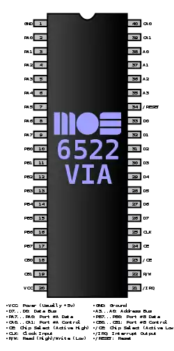 The MOS Technology 6522 Versatile Interface Adapter (VIA) is an integrated circuit that was designed and manufactured by MOS Technology as an I/O port controller for the 6502 family of microprocessors. It provides two bidirectional 8-bit parallel I/O ports, two 16-bit timers (one of which can also operate as an event counter), and an 8-bit shift register for serial communications or data conversion between serial and parallel forms. The direction of each bit of the two I/O ports can be individually programmed. In addition to being manufactured by MOS Technology, the 6522 was second sourced by other companies including Rockwell and Synertek.