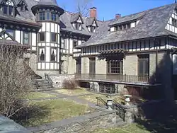 Major's Inn and Gilbert Block is a historic inn and tavern and commercial building at Gilbertsville in Otsego County, New York. The Gilbert Block consists of three 2-story attached brick commercial structures varying slightly in height in the Neo-Tudor Style. It was built between 1893 and 1895, and hosts shops and artist's studios. It was designed by Boston architect Henry Forbes Bigelow. Major's Inn was started in 1896 and finished in 1917 on the site of the original 1822 Gilbert homestead which burned in 1895. It is a 3+1⁄2-story structure with a gable roof covered in slate, interrupted by a number of chimneys, dormers, and conical roofs on towers. It has a rambling effect accented by the use of a variety of projecting balconies and bays, towers, and several porches. The medieval English Tudor and Gothic building was commissioned by Major James L. Gilbert using Augustus Nicholas Allen to construct it. Decorative elements on both buildings incorporate the quatrefoil.[2] The Inn went through a series of owners during the 1950s to 1970s and, beginning in 1980, a group founded by Alan Cleinman which became the Major's Inn Foundation, Inc. began to raise funds for the purchase of the property. Today, under the ownership of the Foundation, the Major's Inn has been significantly restored and serves as a cultural center.