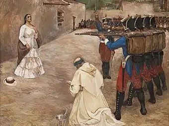 Although the discovered letter was only signed with the heroine's middle name, the royalists soon identified who the sender was. Maria was arrested on 30 March in Huamanga. Carratalá did not even hesitate to torture her. But she completely refused to give names and repeatedly gave the same answer: "I wrote it!”. Finally, Carratalá ordered her execution.[12]