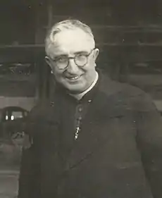 His father worked in the iron and steel industry and so on Olaechea's episcopal coat of arms, instead of lions rampant or eagles with two heads, a chimney of the Altos Hornos iron foundry at Bilbao appeared.[1] He joined the Salesian Society of St John Bosco, and attained a high administrative position in that congregation, until 25 August 1935, when he was appointed Bishop of Pamplona. His episcopal consecration, at the hands of Federico Tedeschini, the Papal Nuncio, was celebrated in Madrid on 27 October. He was the first Salesian bishop of Spain.