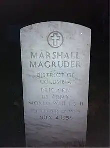 Brigadier General Marshall Magruder (12 October 1885 – 4 July 1956) was born in Washington, D.C. He served in both World War I and World War II. His son was noted aircraft designer Peyton M. Magruder. BG Magruder retired from the US Army in 1946. He was buried at Arlington National Cemetery in Section 30, Site 1092.[1]