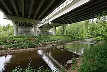 The Intercounty Connector can be traced to plans developed in the 1950s for the proposed 122-mile (196 km) Washington Outer Beltway.[15] The original Outer Beltway had been planned to pass south of the corporate limits of the City of Rockville.[16] The original proposed routing was south and east of the current alignment.[17] The new route was motivated in part by a desire to move the routing of the proposed bridge over the Potomac River upstream from the area of River Bend to Watkins Island.[18] Virginia residents and the United States Department of the Interior objected to the proposed bridge over the Potomac River because they wanted to create state and federal parks along the river in order to protect sugar maple trees, vegetation, and bald eagles. Because of these concerns, the Maryland State Roads Commission moved the proposed Outer Beltway to a route north of Rockville and eliminated a new bridge crossing the Potomac River.[15]