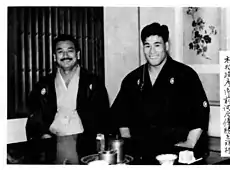 Kimura also trained in karate, believing that karate would strengthen his hands. First, he trained what today is known as Shotokan Karate under its founder Gichin Funakoshi for two years, then switched to training Goju-Ryu Karate under So-Nei Chu (a pupil of Goju-Ryu founder Chojun Miyagi) and finally became an assistant instructor, along with Gogen Yamaguchi and Masutatsu Oyama in his dōjō (the latter also going to university together with him and aikido master Gozo Shioda[8]). In his autobiography, Kimura attributes the use of the makiwara (a karate training implement) as taught to him by So Neichu and his friend and training partner Masutatsu Oyama, as being a significant contributor to his consequent tournament success. He began using the makiwara daily prior to his first All Japan success and never lost another competition bout.
