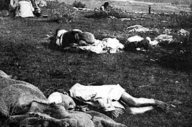 According to an Albanian imam organization, there were around 21,000 simple graves in Kosovo where Albanians were massacred by the Serbian armies.[20] In August and September 1913, Serbian forces destroyed 140 villages and forced 40,000 Albanians to flee.[21] According to documents from the Serbian Ministry of Foreign Affairs, 239,807 Albanians were expelled from Old Serbia between 1912 and early 1914 (not counting children under the age of six); by late 1914, this number increased to 281,747.[22] These figures, however, are controversial and scholarly estimates can be as low as 60,000 or as high as 300,000.[23][24][9] American relief commissioner Willard Howard said in a 1914 Daily Mirror interview that General Carlos Popovitch would shout, "Don't run away, we are brothers and friends. We don't mean to do any harm."[25] Peasants who trusted Popovitch were shot or burned to death, and elderly women unable to leave their homes were also burned. Howard said that the atrocities were committed after the war ended.