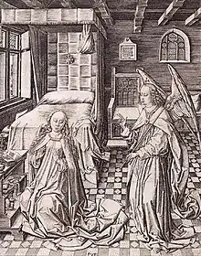 The Annunciation (c. 1480), engraving on paper, 204 mm (8.03 in) x 161 mm (6.34 in). Rijksmuseum Amsterdam (among others)