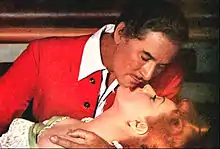O'Hara's last release of 1952 was Against All Flags opposite Errol Flynn, marking her only collaboration with the actor.[149] O'Hara, knowing Flynn's reputation as a womanizer, was on close guard during the production.[150] Though she "respected him professionally and was quite fond of him personally" she found Flynn's alcoholism a problem and remarked that "if the director prohibited alcohol on the set, then Errol would inject oranges with booze and eat them during breaks".[151] According to Steve Jacques, O'Hara outdid Flynn in the combat scenes, many of which had to be cut from the final version to protect Flynn's heroic image.[150] The film was a commercially successful venture.[152][153]