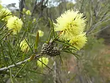 Melaleuca vinnula is a plant in the myrtle family Myrtaceae and is endemic to the south-west of Western Australia. It is a shrub with narrow leaves, heads of white to yellow flowers followed by tight clusters of fruit and it is found in the wheatbelt. It is a newly-described species from a review of the group of melaleucas known as broombrush.