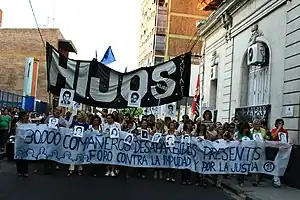 Memory, Truth and Justice processes (Spanish: Procesos de Memoria, Verdad y Justicia) is the name with which the processes that culminate in trials for crimes against humanity carried out against those responsible for human rights violations committed in the context of state terrorism during the last civil-ecclesiastical-military dictatorship in Argentina between 1976 and 1983 are referred to. These include the actions of Human Rights organizations,[1] such as Mothers of the Plaza de Mayo, Grandmothers of the Plaza de Mayo or HIJOS, as well as different public policies such as the creation of CONADEP, the creation of reparation laws, the restitution of appropriated children, the Trials for the Truth, the marking of Sites of Memory in Argentina in the areas where clandestine detention centers operated and the creation of Spaces of Memory.[2]