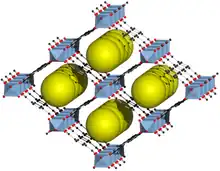 MOF-5 has tetranuclear nodes in an octahedral configuration with an overall cubic structure. MOF-5 has a compressibility and Young's modulus (~14.9 GPa) comparable to wood, which was confirmed with density functional theory (DFT) and nanoindentation.[110][111] While it was shown that the MOF-5 can demonstrate the hyperfilling phenomenon within a loading media of solvent, these MOFs are very sensitive to pressure and undergo amorphization/pressure induced pore collapse at a pressure of 3.5 MPa when there is no fluid in the pores.[112]