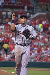 Cabrera made his Tigers debut on March 31, 2008, playing third base in a home game against the Kansas City Royals. In his third at-bat, he hit a solo home run off Royals pitcher Gil Meche. He finished the game 1-for-5 with two strikeouts, and the Tigers lost 5–4 in 11 innings.[29] On April 22, manager Jim Leyland announced that Cabrera would be moving to first base, with Carlos Guillén becoming the starting third baseman. Cabrera had already made seven appearances at first, the first appearances at the position of his career.[30] Cabrera was named the AL Player of the Month for July after batting .330 with eight home runs and 31 RBIs.[31] On September 7, Cabrera reached the 1,000-hit plateau on a home run off Twins pitcher Glen Perkins.[32]