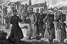 During the January Uprising of 1863, Muravyov was appointed Governor General of Vilna (former Grand Duchy of Lithuania, now Lithuania and part of Belarus). He instituted a complete ban on the Latin alphabet and the Lithuanian language in printed content. The ban was lifted in 1904. He managed to promptly subdue the rebellion. About 9000 insurgents were resettled to Siberia, 127 were demonstratively hanged. Konstanty Kalinowski, Zygmunt Sierakowski and Antanas Mackevičius were among the rebel leaders executed on his orders. Those settlements where the rebels were reported had to pay enormous contributions. As a consequence, for Poles and liberal Russian circles Muravyov became known as the "hangman of Vilnius" [1] even in modern Polish historiography he is sometimes referred to by his contemporary nickname, 'Wieszatiel' ('hangman'). To many nationally minded Russians, Muravyov was a hero and the de facto head of the "Russian Party". They flooded Muravyov with congratulatory telegrams on his nameday, November 8, 1863, a form of public expression previously unknown in Russia.