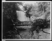 Erosion within the last century has resulted in a falls that is fairly narrowly channeled and vigorous, notably after a heavy rain. Photographs of the waterfall from the 19th century show a much wider, curtain like character to the falls. When the creek is dry, the older, much-broader ledge can be observed. If there were sufficient interest and funding, some remedial work could theoretically restore the 19th-century appearance of the falls.[25]