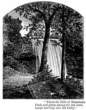 The name "Minnehaha Falls" was in common use by 1855, when the publication of The Song of Hiawatha by Henry Wadsworth Longfellow brought the falls worldwide fame. Longfellow's epic poem features Hiawatha, a Native American hero who falls in love with Minnehaha, a Native American woman who later dies during a severe winter. Longfellow never visited the falls himself. He was inspired by the writings of Mary H. Eastman and Henry Rowe Schoolcraft, and by a daguerreotype created by Alexander Hesler when he chose the name for Hiawatha's lover. The image was taken in 1852, according to a letter written by Hesler, as discussed in "Minnesota History" magazine.[7] Clearly, Longfellow took the name of his character Minnehaha from the falls; the falls were not named for her.[8]