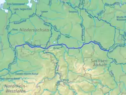 The Mittelland Canal branches off the Dortmund-Ems Canal[2] at Hörstel (near Rheine, at 52°16′37″N 7°36′18″E / 52.27694°N 7.60500°E / 52.27694; 7.60500), runs north along the Teutoburg Forest, past Hanover and meets with the Elbe River near Magdeburg (52°14′46″N 11°44′49″E / 52.24611°N 11.74694°E / 52.24611; 11.74694). Near Magdeburg it connects to the Elbe-Havel Canal,[2] making a continuous shipping route to Berlin and on to Poland.[1]
