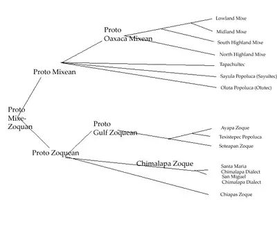 The following internal classification of the Mixe–Zoquean languages is by Kaufman & Justeson (2000), cited in Zavala (2000).[9] Individual languages are marked by italics.