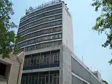 Already since 1949, the completion of the Greek Air Force Assistance Fund building on Akadimias Street, which was designed in 1947 by Thoukydidis Valentis, showed the course that most office buildings in central Athens would follow. The building is completely undecorated with a subtly visible concrete frame in the form of a grid, and has many Corbusian principles such as the ground floor pilotis. Valentis had a consistent ideology behind the design principles of office buildings concerning practicality and aesthetics which he later in 1960 wrote down in Architektoniki [Architecture] review.[32] Some years later, two young architects, Nikos Valsamakis (born in 1924) and Takis Zenetos (1926–1977) also exerted much influence in revitalizing Greek modernism. Their buildings, notably one of Valsamakis's first apartment buildings on Semitelou Street (1951) and Zenetos's Fix brewery on Syngrou Avenue (1957, now partly demolished and renovated houses the National Museum of Contemporary Art), are radically different from their contemporary counterparts. Valsamakis's apartment building on Semitelou Street is devoid of any ornament and has a façade grid formed by balconies and columns. Moreover, its design is inspired by traditional architecture only in matters of materials, such as the stonemasonry of the ground floor and wooden elements elsewhere, and colouring, such as the contrast between white and bright red.[33] Zenetos's designs, on the other hand, are inspired by technological and industrial progress.