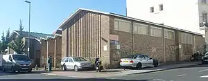 Architecturally, the church has been described as "in isolation not without merit, but too low and spreading" in the context of a closely built urban environment of tall 19th-century buildings.[33] The main façade of the building faced south, with a wide western bay and narrower eastern bay, both topped with shallow gables and separated by an arcade formed by narrow vertical brick slabs topped by a "saw-tooth overhanging roof reminiscent of Coventry Cathedral", which had opened in 1961.[33][34] Behind this arcade was a partly open courtyard. The larger, western part of the building was the church; the eastern section was used as a hall. Both of the southern walls of these bays had an "incised" pattern of vertical bands of recessed bricks.[33][34]