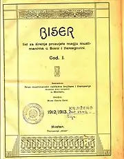 The group was a strong support system for Kalajdžić as a publisher and young store-owner. On 1 June 1912 he launched the magazine Biser, first as a monthly magazine, and in 1913 in a bimonthly format, intended to be a non-political replacement for the defunct political magazine Behar.[10] One of the most important moves in Kalajdžić's publishing and editorial work was hiring poet Musa Ćazim Ćatić who wrote poetry and essays for the paper as well as contributing translations of numerous Turkish and Arabic studies and books for the Muslim Library that Kalajdžić had established.[11][12][13] The main theme of these publications was Islam and Bosniak culture, but also works of literature, didactics and textbooks.