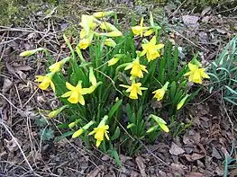 Narcissus 'Tête-à-tête' is a hybrid cultivar of Narcissus, which was introduced in 1949.[1] It is one of 110 cultivars produced by British daffodil breeder Alec Gray.[2] 'Tête-à-tête' is a popular ornamental plant, which is known for its very early flowering period and short stature.[3] This cultivar is commonly used as a garden plant where it can be planted in pots,[4] rock gardens, garden borders[5] and even naturalized in lawns.[6] The cultivar name 'Tête-à-tête' means to have a conversation between two people,[7] which relates to the cultivar often hosting a pair of flowers per stem.[8]