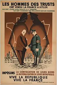 In World War II, many governments, organizations and individuals collaborated with the Axis powers, "out of conviction, desperation, or under coercion."[1] Nationalists sometimes welcomed German or Italian troops they believed would liberate their countries from colonization. The Danish, Belgian and Vichy French governments attempted to appease and bargain with the invaders in hopes of mitigating harm to their citizens and economies.