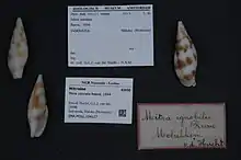 - ↑ Mitra ustulata (Reeve, 1844). Retrieved through: World Register of Marine Species on 11 December 2018.