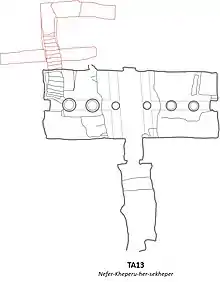 The tomb is unfinished and in a good state. Its layout is similar to that of other Amarna tombs. It consists of one room, with six white columns in one row perpendicular to the entry; the distance between the two middle ones is slightly more than between the others. Work has been started on the back wall of the room, there would have been another room or possibly a shrine there. Decoration below the ceiling is complete, only the colours and the inscriptions are missing. Decoration lower on the wall is completely missing; on the south side even the columns haven't been carved completely.[4] By the time the burial took place it must have been evident that the tomb wouldn't be finished; after finishing the room and most of the columns the workers began to work in the northeastern corner, the usual place of the stairs leading to the burial chamber. The chamber itself was just large enough to contain the sarcophagus. Two corridors leading from it are either contemporary or were carved later.[4]