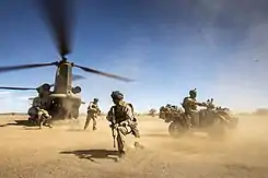 Special forces of the Korps Commandotroepen were deployed to Mali since 2014 as part of the UN mission MINUSMA.[38] The primary task of the Dutch forces was to gather intelligence on local Islamist and rebel groups and to protect the people of Mali against said groups.[39] Since 2016, conventional detachments consisting of 11 Air Assault Brigade and 13 Light Brigade troops were part of the MINUSMA rotations as well. Additionally, the Dutch contribution consisted of a RNLAF AH-64 Apache and CH-47 Chinook detachment which provided the necessary air support and transport for the infantry units on the ground.