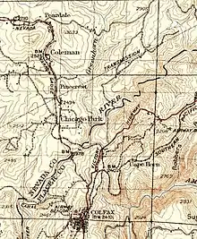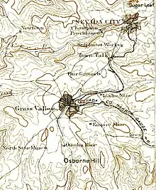 The Nevada County Narrow Gauge Railroad (NCNGRR) (nickname: Never Come, Never Go) was located in Northern California's Nevada County and Placer County, where it connected with the Central Pacific Railroad.[1] The Nevada County Narrow Gauge Railroad Company incorporated on April 4, 1874,[2] and was headquartered in Grass Valley, California. After two years of construction, passenger and commercial rail services began in 1876 and continued until 1943. The 22.53 mi (36.26 km) line ran from Colfax, north through Grass Valley to Nevada City. At one time, the railroad was notable for having the highest railroad bridge in California, the Bear River Bridge, built in 1908.[3]