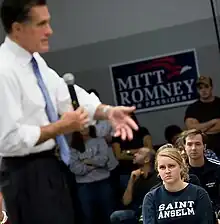 In August 2012, Mitt Romney and Paul Ryan held a town hall event for 3,000 plus people on the college quad. The event was covered by all of the national media outlets not only because it was Mitt Romney's 100th town hall event, but it was the first time since announcing that Paul Ryan would be his running mate, that the two appeared in New England. As is often with television "live shots" from the Alumni Hall, the Abbey bells tolled at 11:00, interrupting Paul Ryan during his remarks. This caused Romney to quip, "Only a Catholic guy (Paul Ryan) would be able to get the bells to toll just at the right time at Saint Anselm".[55]