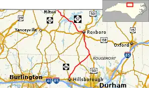 North Carolina Highway 57 (NC 57) is a 43.1-mile-long (69.4 km) primary state highway in the U.S. state of North Carolina and a semi-rural traffic artery connecting Roxboro to a few small-to-medium-sized towns in The Triangle region north of the cities of Durham and Chapel Hill.