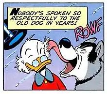 The old dog's name is Barko. The owner explains that Barko was once the North's greatest champion, but now he's old and stricken with rheumatism. It's then revealed that the other dog team is Soapy Slick's champion racing team (as the owner tells Donald this, Slick and his team pass by). Scrooge remembers how Barko helped deliver serum to Nome (a reference to the 1925 serum run to Nome). Befriending the old duck quadzillionaire, Barko nips the other dogs into their positions. Scrooge tells his nephews to stay in town while he deals with Soapy. Despite this, Huey, Dewey, and Louie try to follow, but cannot keep up with the team's speed.